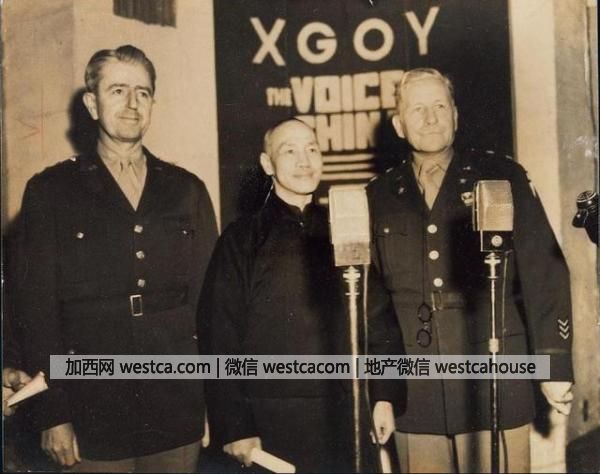 1945年,蒋介石、魏德迈(左)、赫尔利联合发表抗战胜利演讲