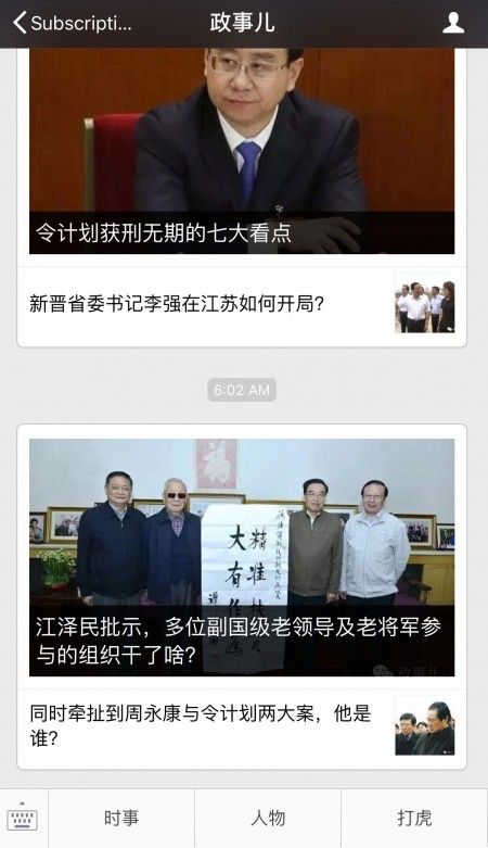 次日,大陸《新京報》微信公眾號“政事兒”在微信上發表了兩篇文章:壹篇題為“江澤民批示,多位副國級老領導及老將軍參與的組織幹了啥”,另壹篇題為“同時牽扯到周永康與令計劃兩大案,他是誰?”。兩篇文章的標題壹上壹下緊挨在壹起。