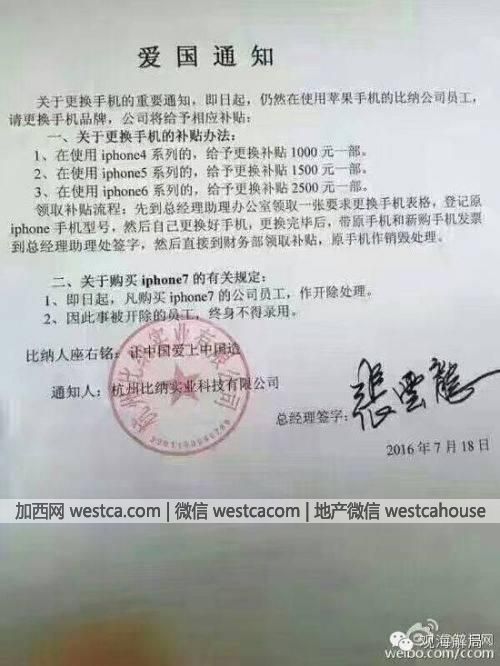 “即日起,仍然在使用蘋果手機的公司員工請更換手機品牌,公司將給予相應補貼;凡購買iPhone7的公司員工,作開除處理,因此事被開除的員工終身不得錄用……”