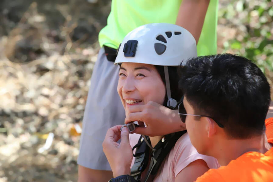 霍启刚为郭晶晶戴安全帽。(资料图)