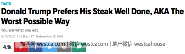 《赫芬頓郵報》認為,喜歡全熟牛排是失禮行為,會讓有才華的大廚感到失望,覺得川普糟蹋了美食。此外還質疑,吃全熟牛排的川普和他的支持者到底有沒有共同點。你和絕大部分的喜好都不壹樣,你覺得你當得好總統嗎?