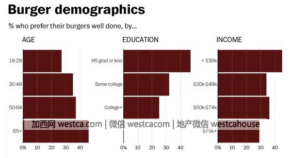 《華盛頓郵報》還將曾經做過的關於美國人愛吃全熟漢堡與收入、學歷之間的關系擺了出來。事實證明,全熟漢堡的喜好者集中在年齡高、低學歷、收入低的群體,而他們也是川普支持者的核心組成部分。