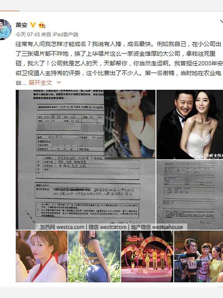 黄安这样写道:“经常有人问我怎样才能成名?我说有人捧,成名最快。例如我自己,在小公司出了三张唱片都不咋地,换了上华唱片这么一家资金雄厚的大公司,拿钱往死里砸,我火了!公司就是艺人的天,天都帮你,你当然走运啊。我曾担任2005年安徽卫视猫人主持秀的评委,这个比赛出了不少人。第一名谢楠,当时她在农业电台当个小DJ,比到一半打算不比了。她母亲跑来问我的意见,我说农业电台有什么好待的,谢楠有冠军相啊,宁可辞职也要继续比下去。她母亲应该接受了,谢楠果然拿了冠军。谢楠恐怕到现在都还不知道,如果当时我对她母亲讲最好退赛,她的人生将完全不一样,我是贵人啊。谢楠发展的不错,后来嫁给了吴京。”