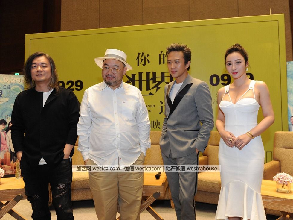 张嘉佳(左一)与导演张一白、演员邓超、留柳岩合影。