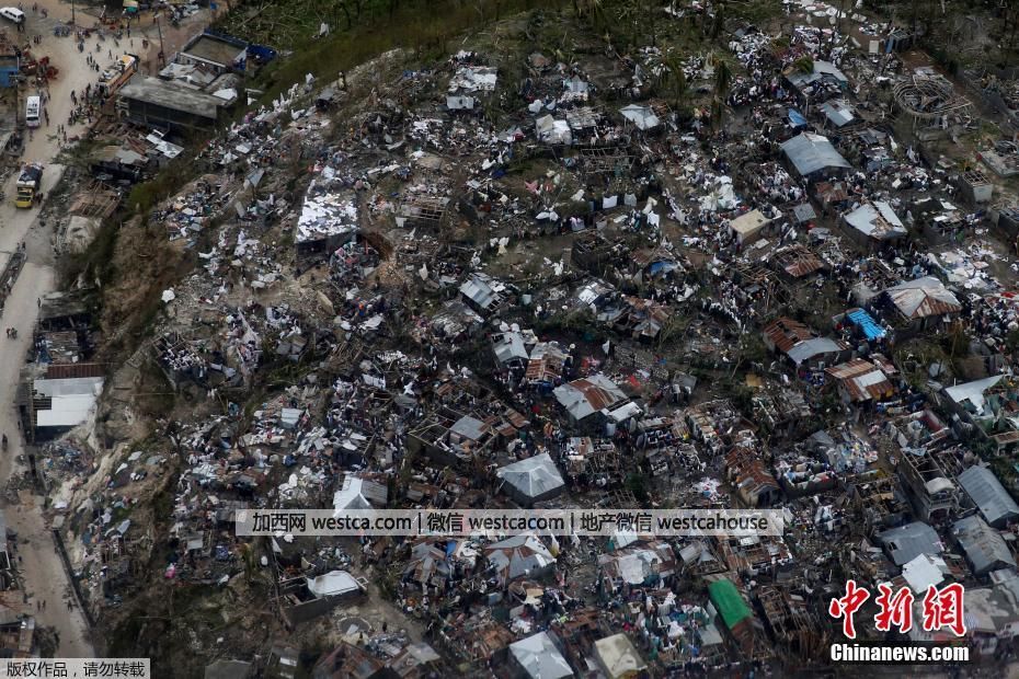 在海地Jeremie,颶風“馬修”導致當地的棚戶區房屋大量被毀。