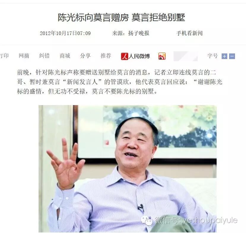 莫言買房的消息傳開後,陳光標還要送他壹套別墅,不過遭到拒絕