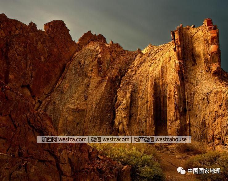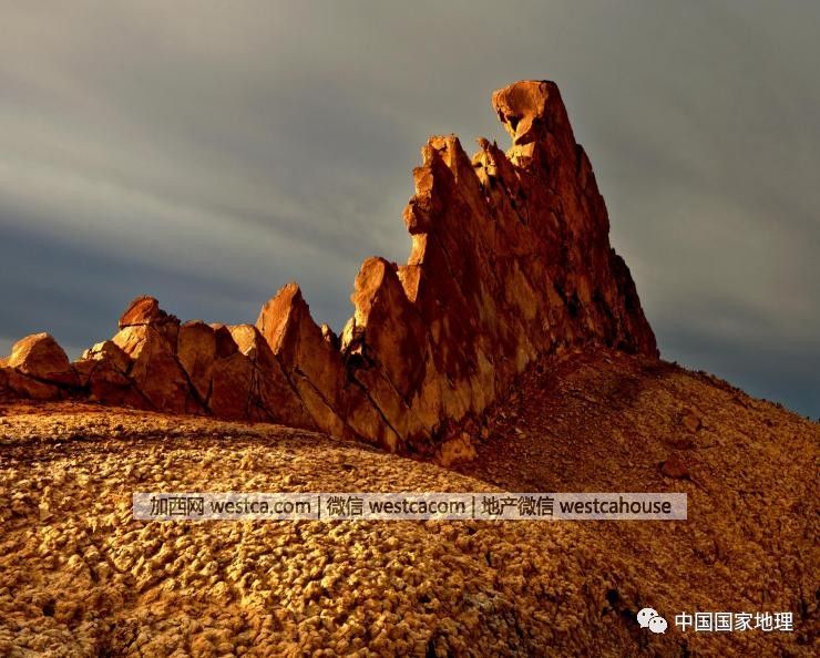 那些起伏的岩石垄脊,紧密地以“垄”和“槽”的形式错落相间,并排着向西南方向奔去。站在龙脊谷,仔细观察你会发现,这些所谓的“脊”,是由一个个层理近似于垂直地面的砂岩层组成。在晨光照耀下,原本红色的砂岩,像是涂了一层金色的鳞甲,呈现出一种气势磅礴的色彩。另外,在隆起的垄脊和凹陷的沟槽之间,各层岩块的颜色并不相同,它们在纵列延伸向前排列,构成了一条条色彩丰富的“长龙”。