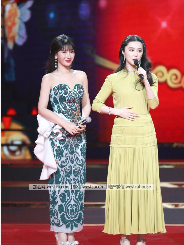 柳岩一袭彩钻裙凸显出蜂腰翘臀,范冰冰一身嫩绿色长裙凸显气质,但由于衣着宽松,与一旁前凸后翘的柳岩相比,并没有凸显出玲珑身材。