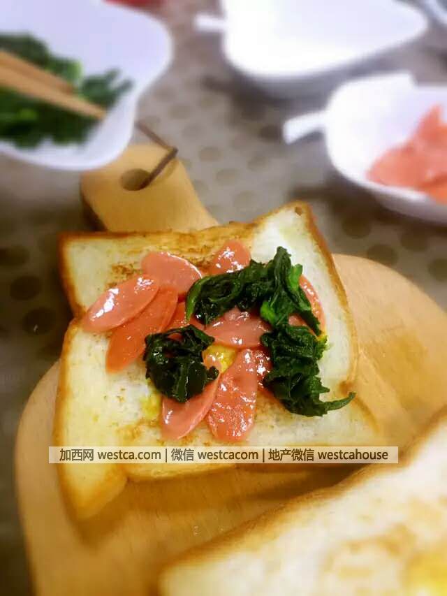 4. 将之前准备好的脱水菜心铺在吐司片上,最后在上面盖上一层吐司片,切成你想要的形状。