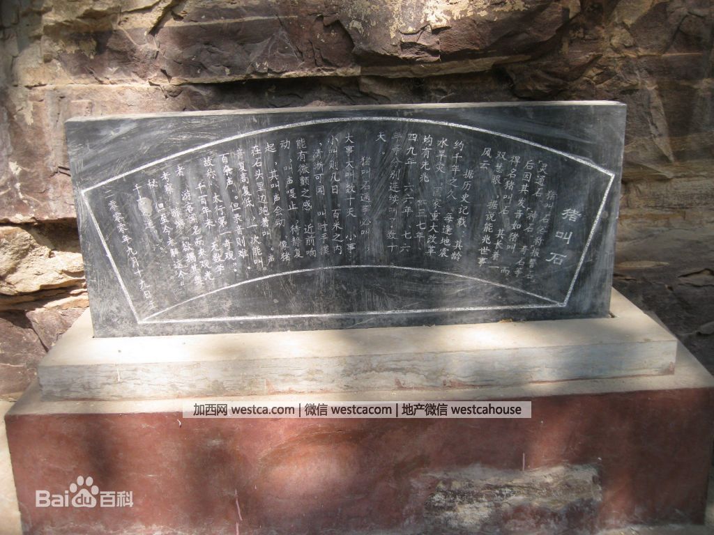 據大陸百度“豬叫石”詞條顯示,豬叫石神奇還在於,叫時手摸有微顫之感,好象它非常激動似的。靠近時如果發出響動,這奇石象受驚嚇似的叫聲嘎然而止,待靜後叫聲復起,其叫聲有動感,像豬在石頭裡邊跑邊叫,聲音忽高忽低,壹次能叫百余聲,但奇怪的是錄音則難。故此這塊千古之謎的石頭被稱作“豬叫石”。