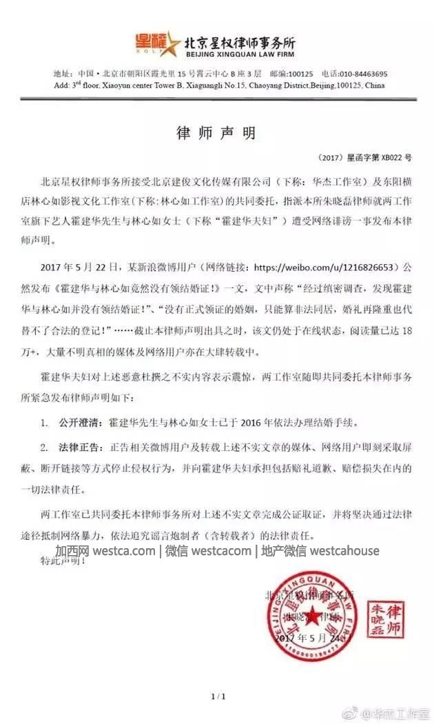 對於網上傳的霍建華林心如夫婦並未領證、是“非法同居”的消息,今天下午,兩人的工作室迅速的在網上發表了聲明辟謠,並且要求爆料者立刻刪除關於兩人婚姻未領證的內容,雙方工作室還表示會依法維護雙方的權益。