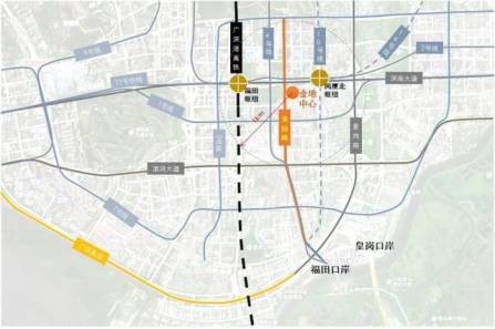 金田路金融走廊,由中心區壹路直連國花路穿至福田口岸,由北向南分別與深南大道、濱河大道、皇崗路(廣深高速入口)交匯。