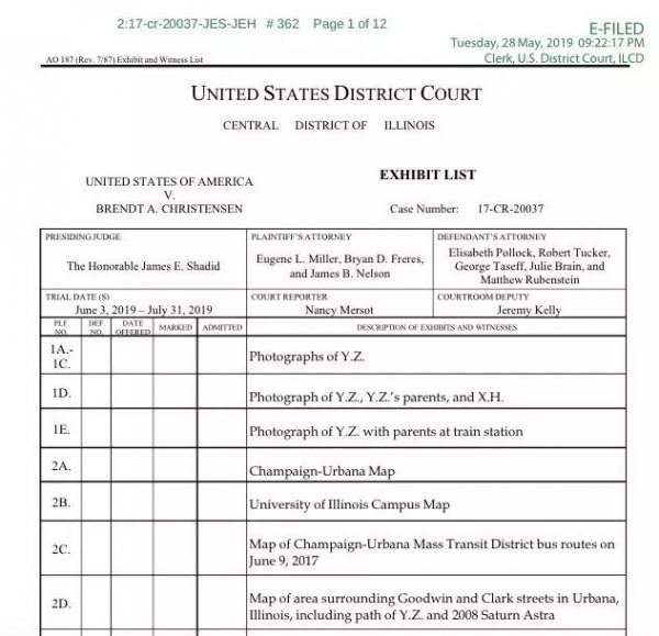 其中聯邦檢察官提交的證據清單長達12頁,包括瑩穎的日記、克裡斯滕森公寓的法醫證據,以及與案件相關的棒球帽、地毯、強力膠帶、女性照片等等。
