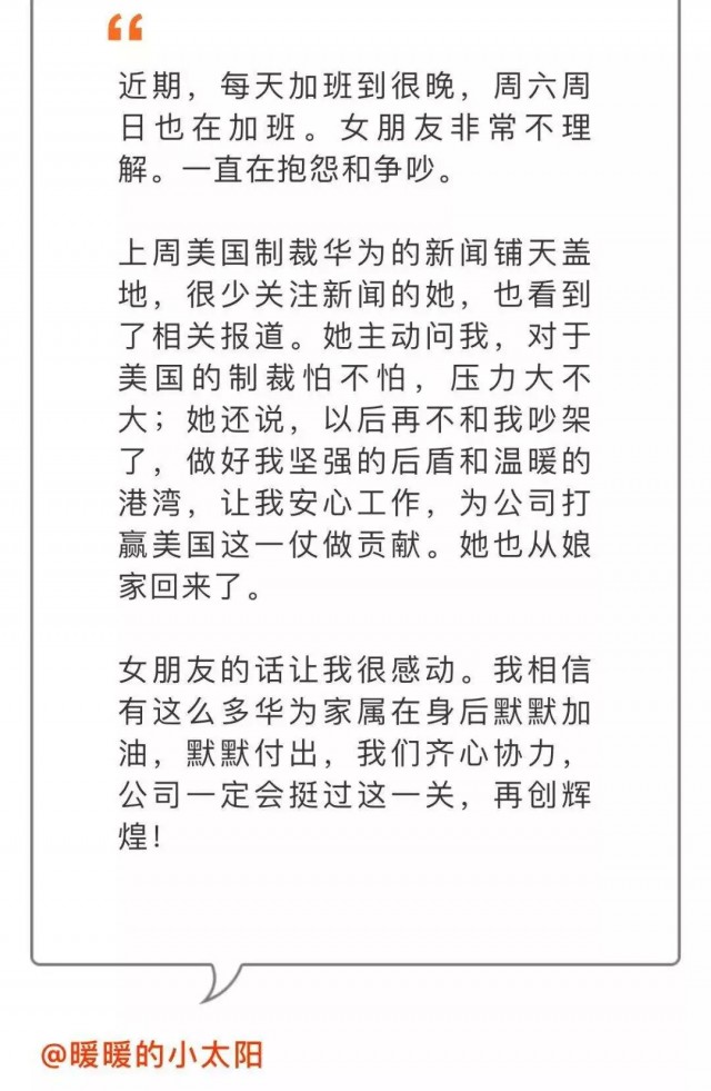 就這樣,很多員工都是以公司為家,累了就在公司打地鋪,睡壹會繼續幹活。有母親給在華為的兒子寫信,只有沉甸甸的壹句話,不要做逃兵。新娘給在華為上班的愛人說,家裡不用你擔心....