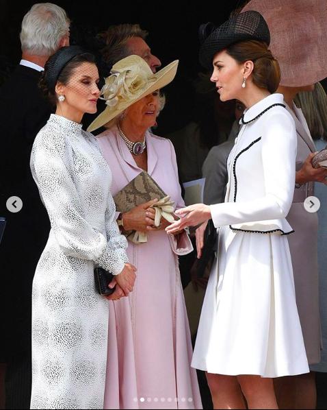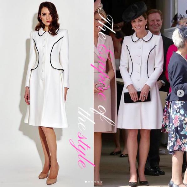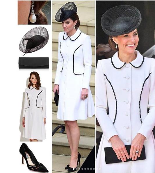 凱特王妃穿著Catherine Walker的白色紐扣式鑲黑色蕾絲Liza外套,高跟鞋來自Prada,而手拿袋來自stuart weitzman,帽子來自Lock & Co(是她自2011年以來第肆次佩戴這款帽子) ,少有的全名牌加身,務求在每個細節都完美,才不至於在各國王妃王後前失禮。