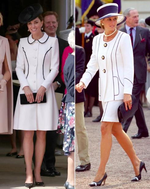 細究她的著裝,會發現謹慎不出錯路線的凱特,造型應該是向已逝的婆婆戴安娜取經了,她的禮服連身裙來自戴安娜王妃最喜愛的設計師之壹Catherine Walker,更重要的是,鑲黑色蕾絲邊的線條設計,與已故戴妃於1995年的壹個造型非常相似:她當時穿著壹件帶有海軍式滾邊的白色叁扣裙套裝,帶著她的兒子威廉王子和哈裡王子參加某個50周年慶典活動。