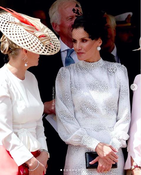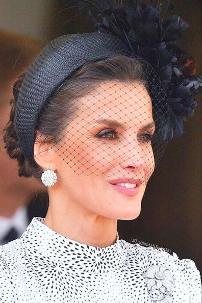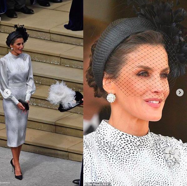 萊蒂齊亞王後的著裝也很有特色,Cherubina的白底黑色波點禮服裙(價值在3000元人民幣左右),袖子運用了燈籠袖設計,而腰部扎緊,更顯腰部曲線,頭戴Cherubina的黑色網帽,大方得體,她腳踩Manolo Blahnik的黑色高跟鞋,戴的耳環來自 Cartier Chaton,架勢非凡,來自上世紀在位的前西班牙王後維多利亞·尤金妮(Victoria Eugenia ),屬於歷史文物、鎮國之寶,也是西班牙王室的收藏,僅在出席大活動時借出,可見這次場面完全給足。