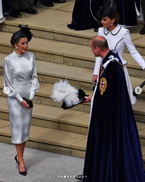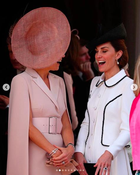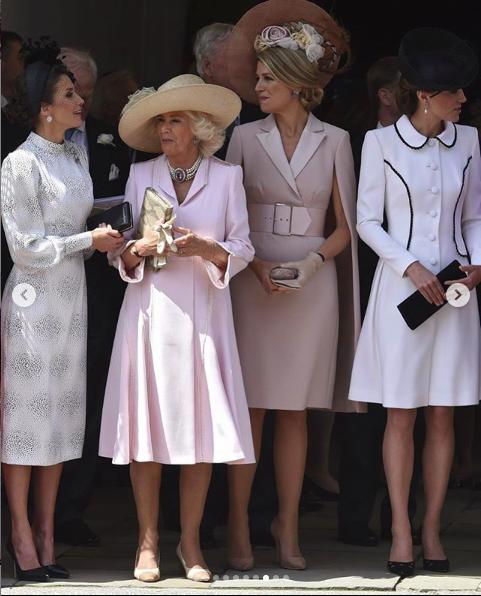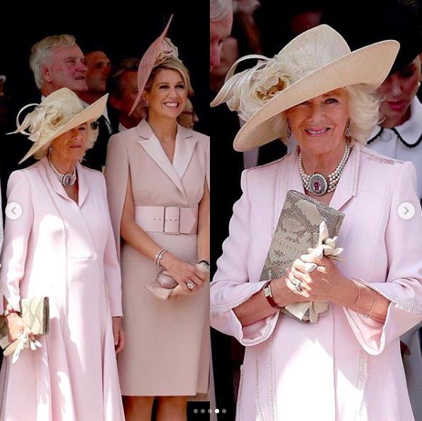 卡米拉配對荷蘭馬克西瑪王後的粉色著裝,也是極不搶鏡。Anna Valentine的粉色長裙穿過很多次,戴的是Philip Treacy的帽子。