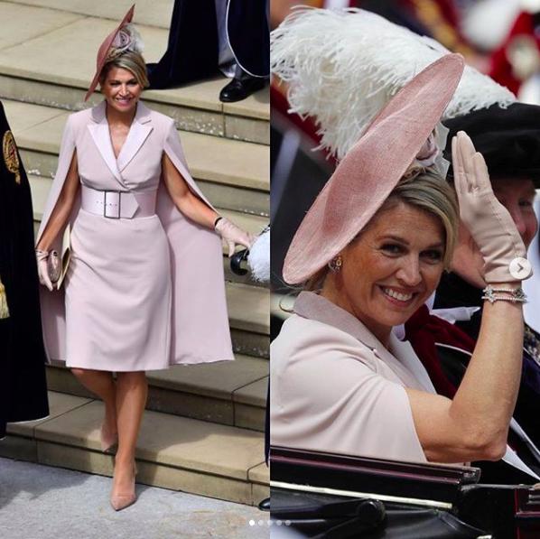 荷蘭馬克西瑪王後特別喜歡披風設計的禮服裙,此次也不例外,Claes Iversen的粉色披風裙,還別了個大腰帶,Jane Taylor的帽子,整體造型全部都是粉色系。
