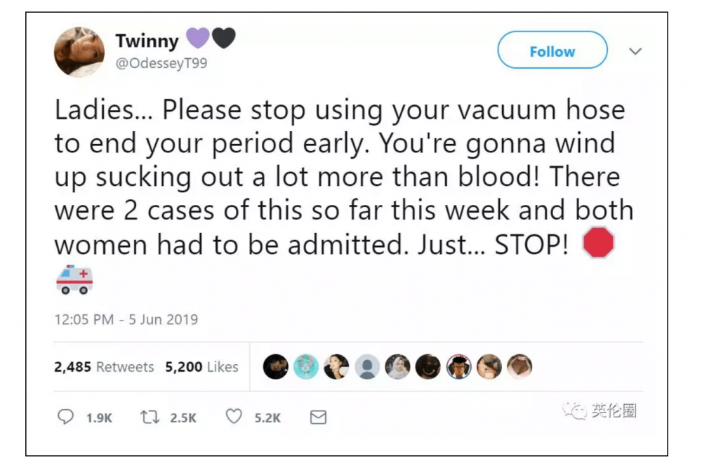 最近,西雅图的一位护士发了一条Twitter,在网路上爆红。她写道:「小姐们,请别再用你家的吸尘器抽月经,试图让它提前结束了好吗?因为你吸出来的可不止有血!」光是那个星期,就有2个女生因为这样的原因被送医了。