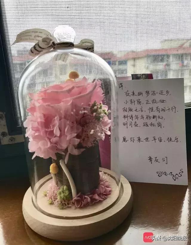 杨俪萍曾住的房间如今已被作为杂物间,房门紧闭。粉色墙壁,白色家居,母亲和小狗的照片压在书桌的玻璃下,床尾墙壁上还留有她以前贴的日文贴纸,翻译过来是“难过的时候笑一笑”。
