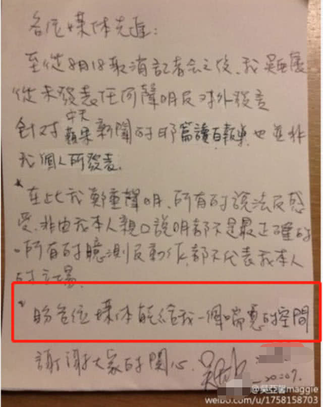 而吳亞馨也在自己的社交平台上對於這件事做出解釋,祈求各大媒體能給自己壹個喘息的機會,在其聲明最後對大家對於她的關心,表示了感謝。