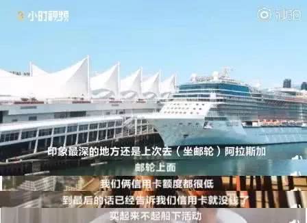 事情发生在信小呆和同伴,在阿拉斯加乘坐邮轮的时候,因为她们的信用卡额度本来就不是很高,结果在游轮上信用卡直接透支,尬尴到下船费用都付不出来。