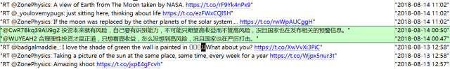 2010年以後,該用戶只在2011年和壹個字符串ID有過壹次互動,然後就跳到了2018年,開始轉推很多西班牙語或英語推文,那些推文似乎是隨機選自正常用戶。