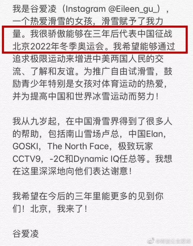 “我很骄傲能够在三年后代表中国征战北京2022年冬奥会,我希望在今后的三年里能更多的见到你们!北京,我来了”她在微博里写道。