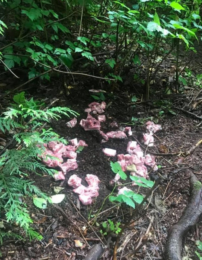 Jeff Curr說這些肉被是他家狗狗在本那比山步道North Road入口處的灌木中撿出來的。