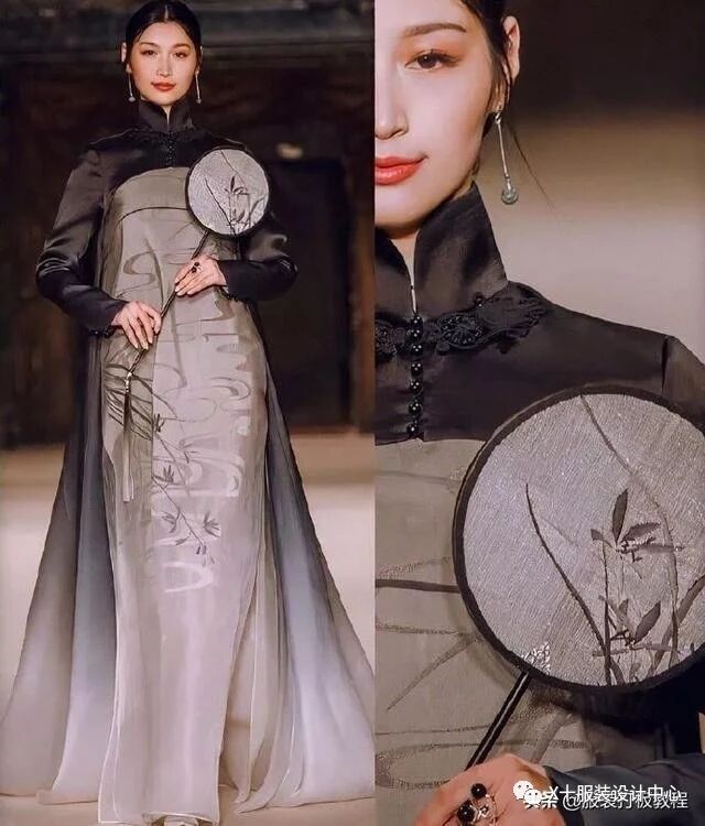她从中国上下五千年的深厚底蕴中汲取了诸多灵感,以水墨为底色,取梅兰竹菊为形,设计的服装飘逸雅致,古色古香。