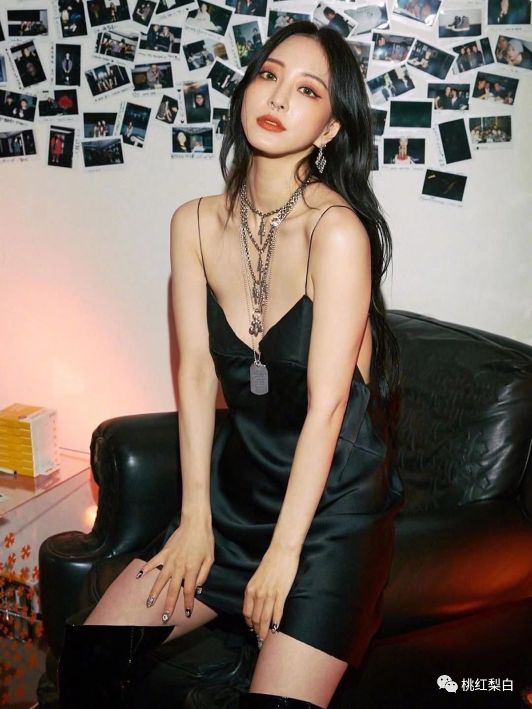 参加时尚活动,穿了最显身材的黑色吊带连身裙出镜,修身的款式和亮面的绸缎面料,加上酷酷的漆皮过膝高筒靴,整个人看起来性感又帅气,鼻环的尝试很为整体的暗黑朋克风加分。