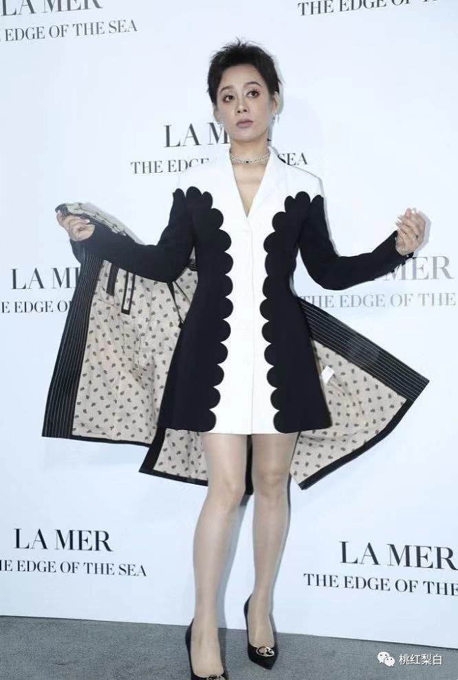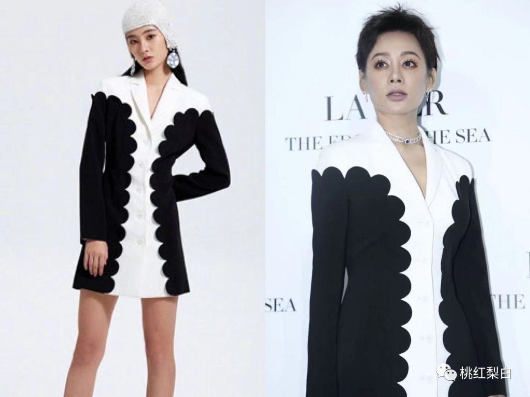 这条黑白波纹设计的连身裙,本身的视觉效果已经足够丰富了,走红毯拍照的时候外套就出现的很突兀,感觉一点没给整身造型加分,反倒是一个一看就繁复无比的拖后腿单品。