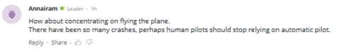 还有人提醒这名飞行员“集中注意力”,“发生过这么多的空难,也许飞行员们应该停止依赖(飞机)自动驾驶仪”。↓