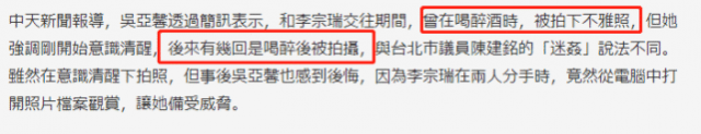 還有壹張是吳亞馨身穿白色T恤,表情微紅似乎是喝了酒壹般,不是拾分的清醒,而前男友則用手掀起吳亞馨的上半身衣物,致使吳亞馨漏出了隱私部位。