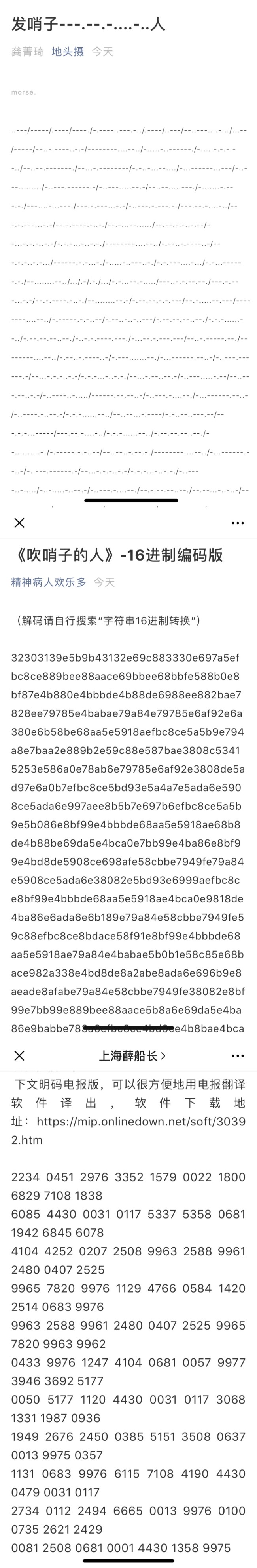 再下面是密碼版本:包括莫爾斯碼、16進制編碼,已經電報明傳碼(網上似乎還有贰進制編碼版,但我壹時沒找到截圖);