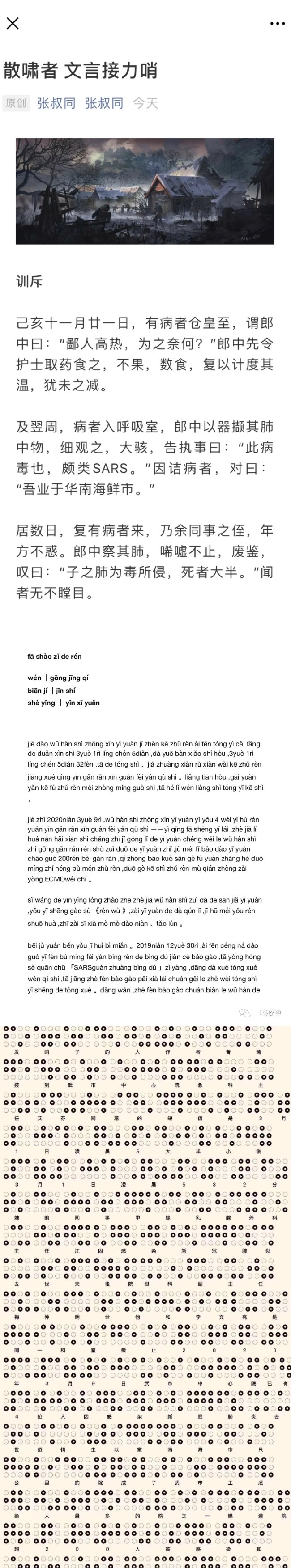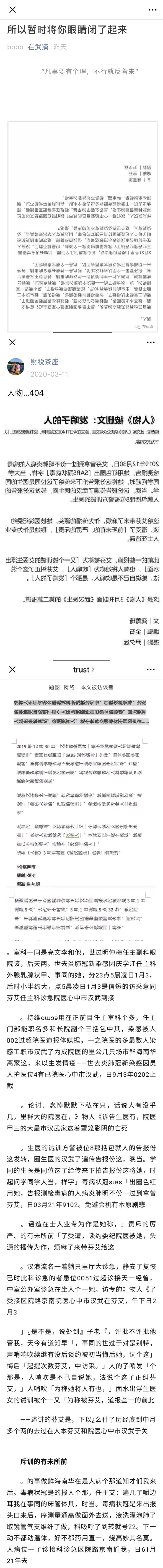 大陸的《人物》雜志在3月10日刊發了壹篇題為“發哨子的人”文章。采訪了武漢壹位女醫生,她去年底最早把武漢肺炎病毒報告發到醫生群體裡,後來被其他人(包括李文亮醫生)拿去公開或半公開提醒別人注意安全。所以她不認為自己是“吹哨人”,只能算“發哨子的人”。
