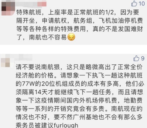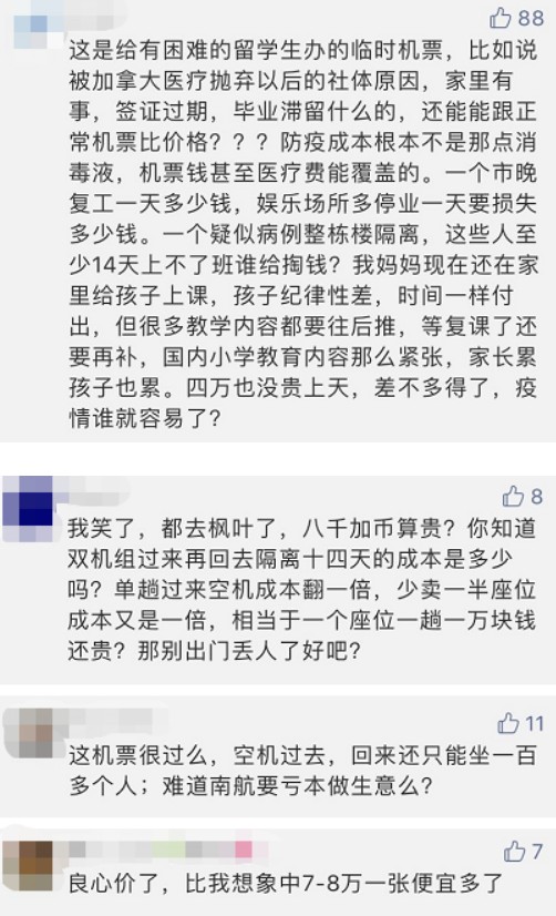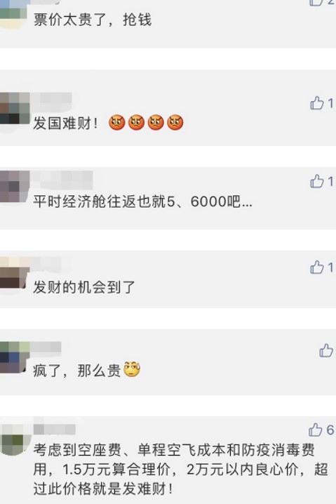 不过很多人表示,这次特殊时期包机回国的上座率低,同时还有其他各种各样的特殊费用,机组人员隔离14天等都是成本,4万人民币真的不算贵了