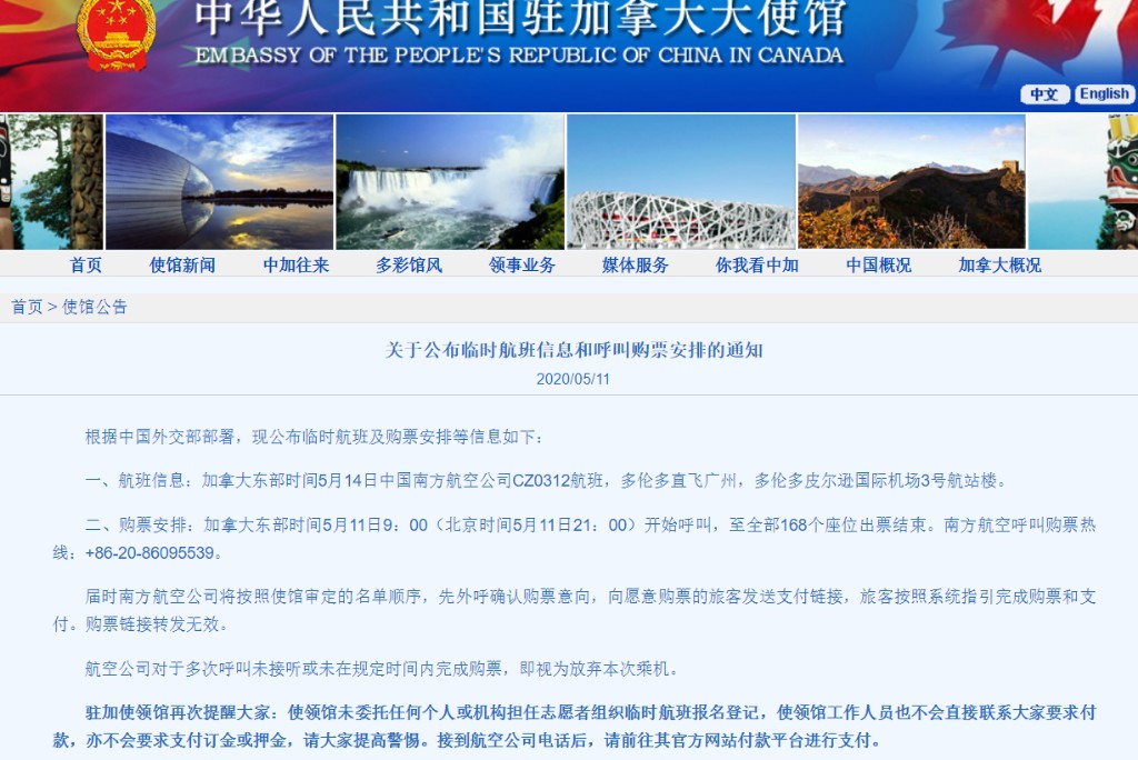 CZ0312临时航班由南方航空公司执飞,从多伦多前往广州,仅为协助少数确有严重困难留学人员,而且座位有限,并非每一个登记的人员都可以登上14日的临时航班。