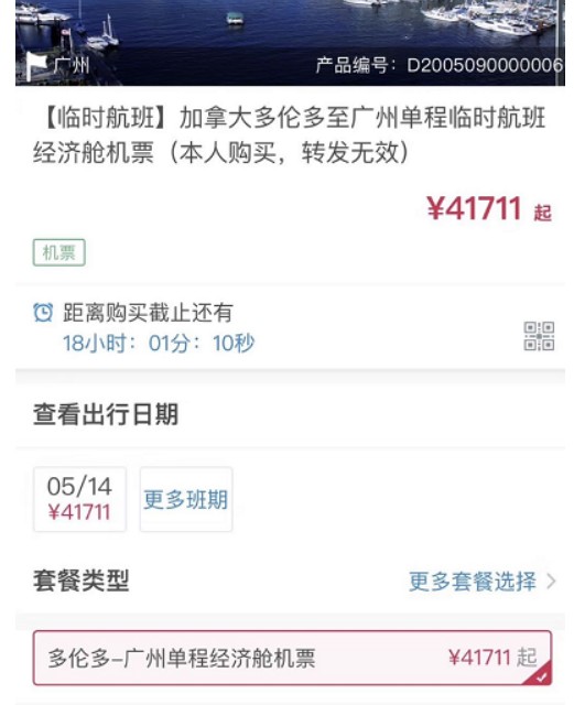 单程经济舱机票价格为41,711人民币(约8,000加币)。
