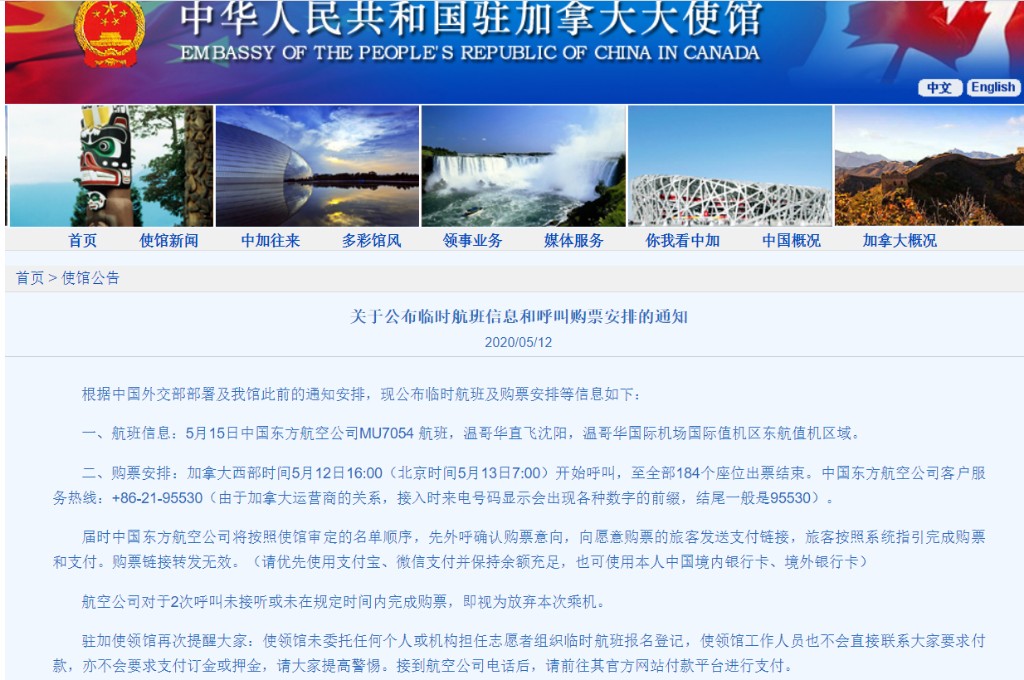 大使馆5月11日和5月12日发布临时航班信息和呼叫购票安排的通知