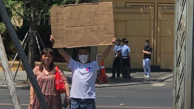 2020年5月10日,肆川公民謝俊彪在省兩會會場外舉牌請願。