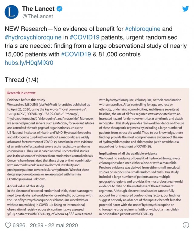 不过,最近教授翻车了……国际权威医学杂志《柳叶刀》发表论文称,经过对近1.5万名新冠肺炎和8.1万名对照患者的大型观察性研究发现:没有证据表明氯喹和羟氯喹对新冠肺炎患者有益