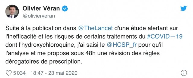 卫生部长奥利维尔·维兰(Olivier Véran)急了:“@法国公共卫生高等委员会,48小时内,我要得到关于羟氯喹处方治疗规定的修改建议!”