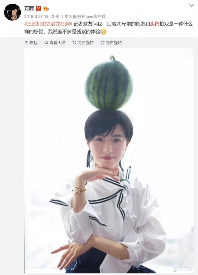 她說古裝頭飾太重的感覺如同頂了個西瓜,就自拍“頂呱呱”。