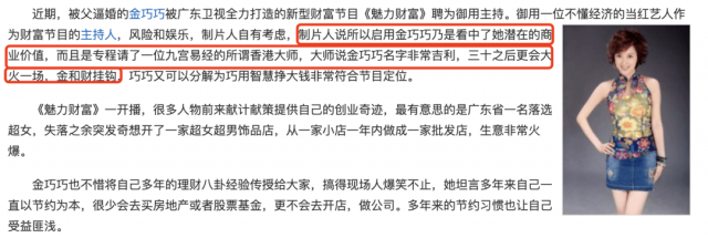 被如今公关删稿骚操作支配的阿姨,回顾这些八卦时只觉得,啊,怀念那个社区论坛时代。在娱乐圈摸爬滚打的初始阶段,金巧巧也和如今的各位大花们一样故事不断。有风光,也曾摔到过泥里,但哪怕呈匍匐状,也要一步一步往前爬。那时候,金巧巧的所有收入都是交给父母打理,不慎被骗走全部身家,落魄到什么地步呢?广东卫视有档节目叫《魅力财富》,打着和商业精英大佬对谈的旗号,其实很多时候都是每天下午给赞助商做品牌推广。已经演过许多经典角色的金巧巧自降段位,去跑场做主持,没有棚,只有一个录节目的背景,妆化也很粗糙,导致整个人常常看起来疲惫无力。比较有意思的是,当年制片人解释启用金巧巧跨界做主持的原因,说是算命大师算出了她的吉利↓
