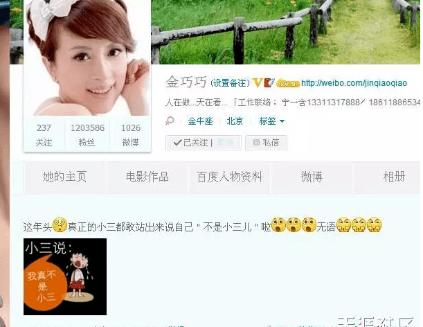 柳岩插足的新闻当年也是很火,但金巧巧也不好骂男人,只能在个人微博上隔空叫板一下做小三的女人。