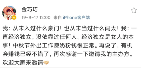 还有“丢手机”事件。她被爆手机遗失,露骨短信泄露,声称是金巧巧的回复内容又刚正不阿:“如果是正常广告,我们可以合作,这样的事情,我不会接,更不可能去”。