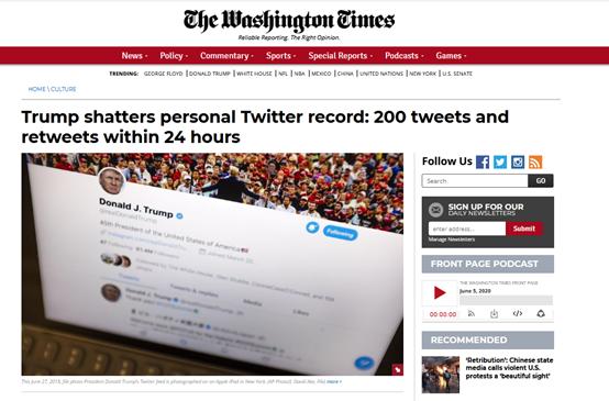 △特朗普6月5日24小时发布200多条推特,平均7分12秒发一条,打破了此前142条的纪录,而且这个推特风暴是在“应对疫情不力”和“黑人之死”两条战线上全部遭遇猛烈批评之际刮起。