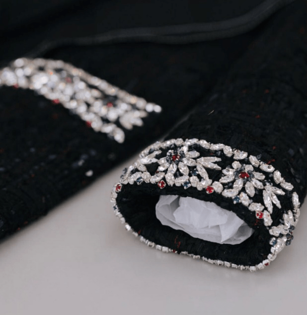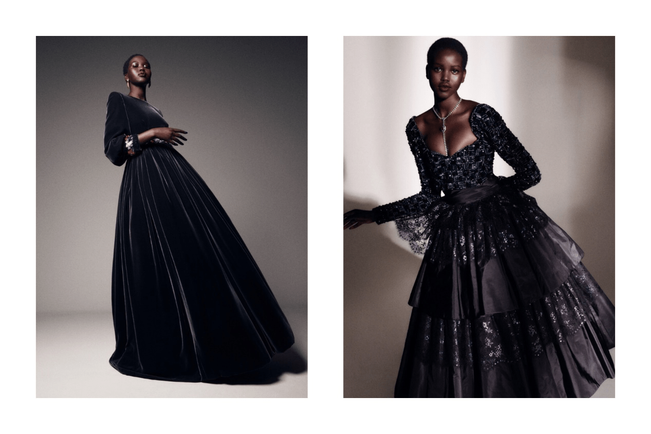 經典的斜紋軟昵在本次也得以創新,以亮片、水鑽、寶石和珠子等元素為其增添華美。大片中的模特們身著滾邊點亮墨黑色褲裝套裝,短款收腰連衣裙、花冠形半身裙與長款連衣裙,恰似從19世紀繪畫中走出的女貴族。